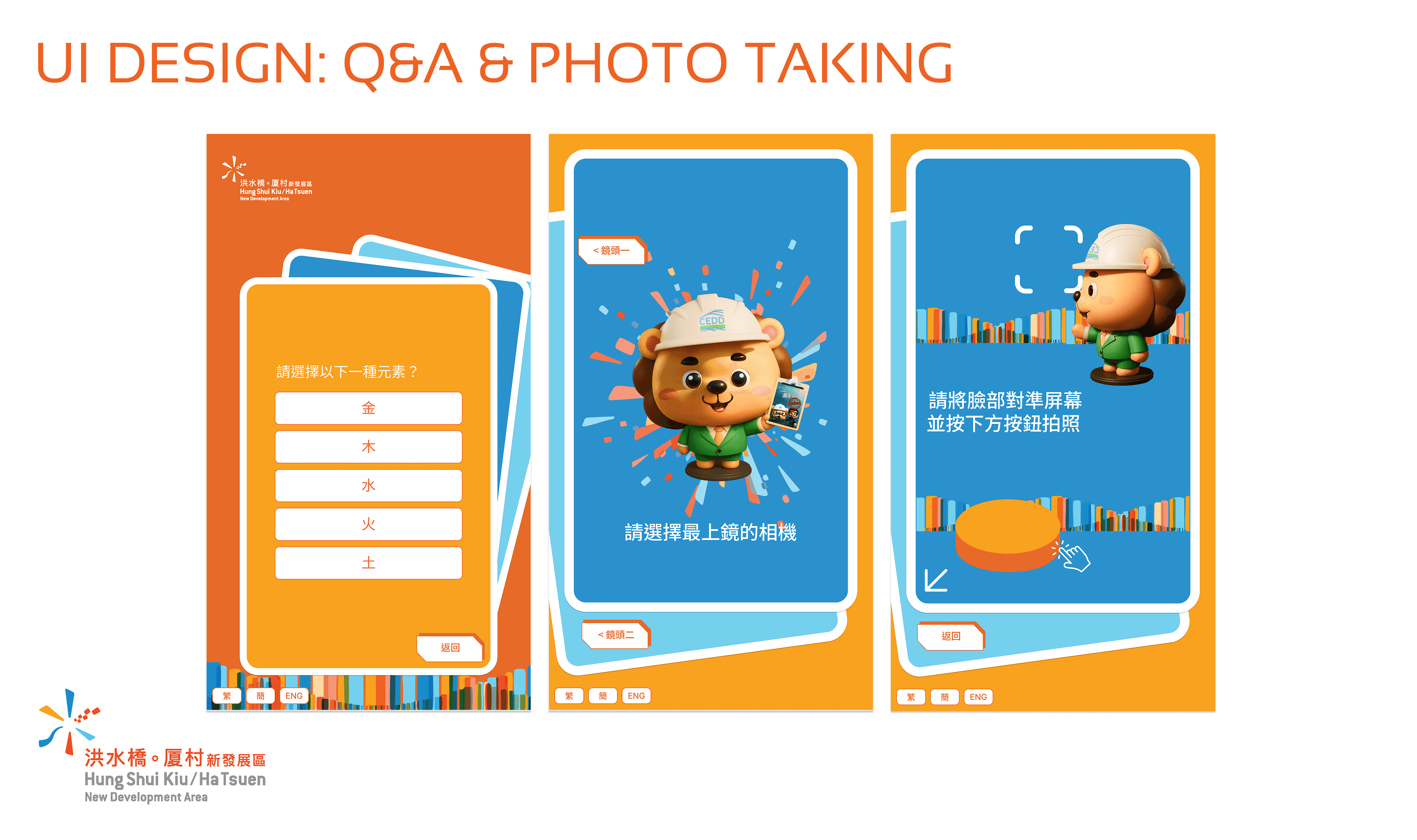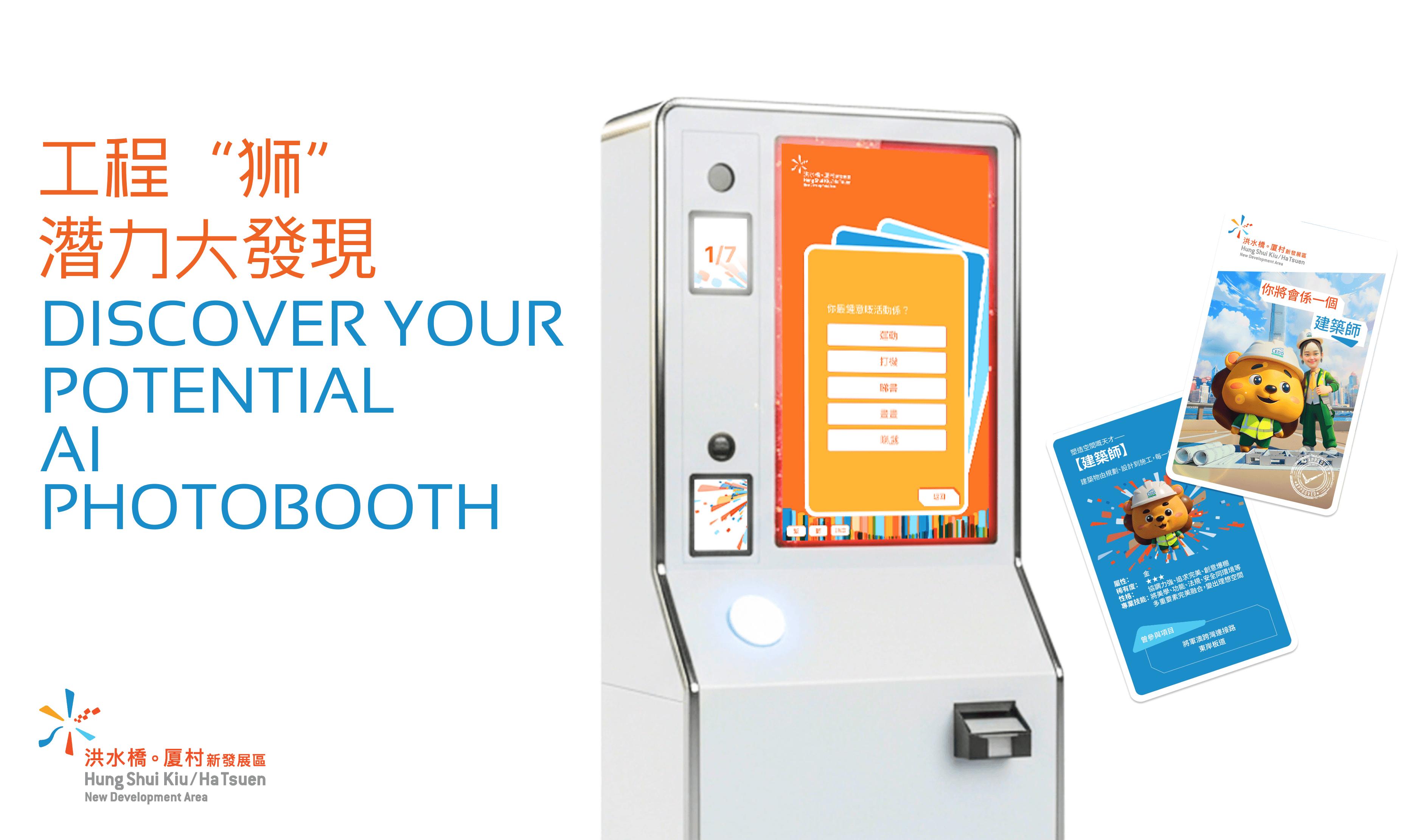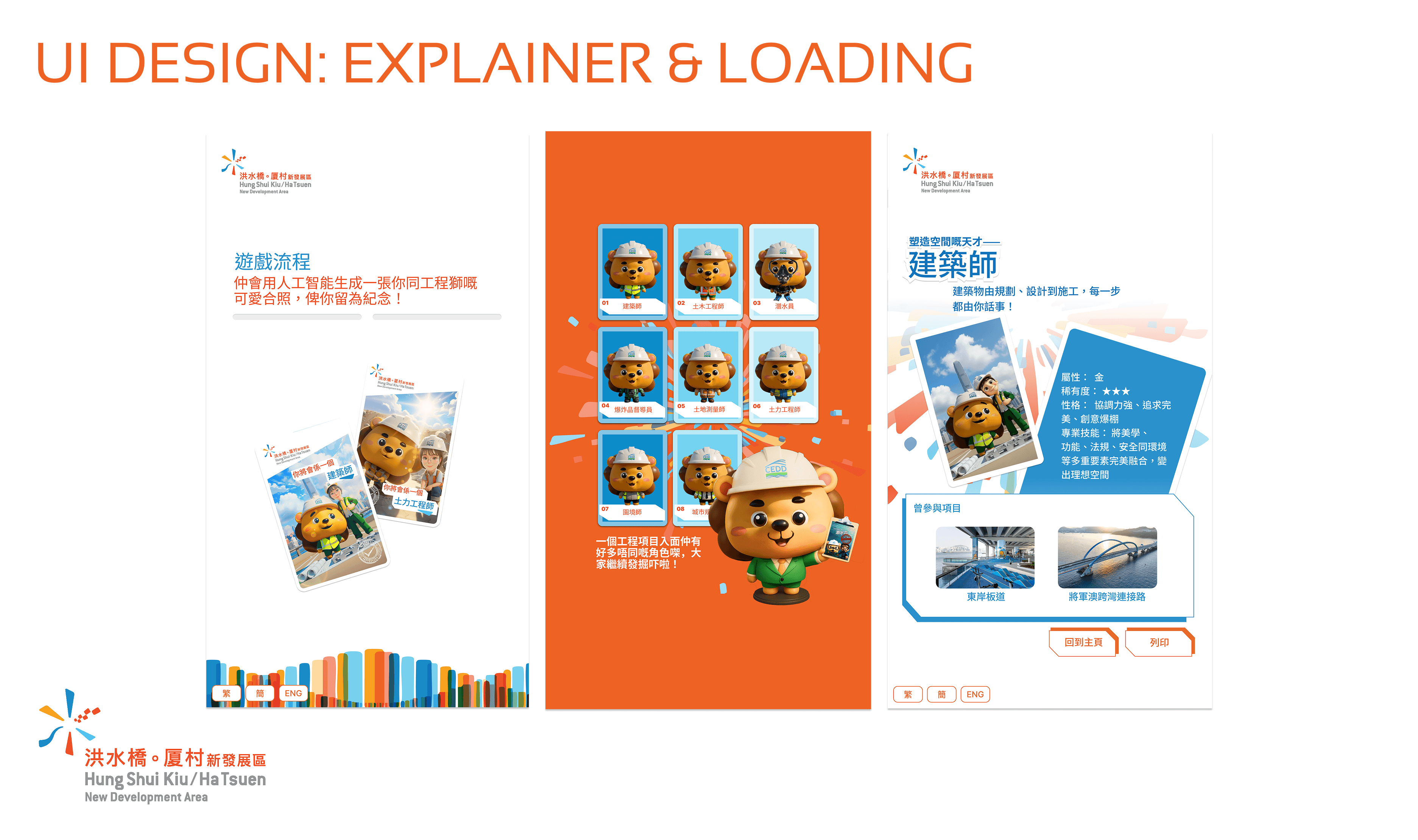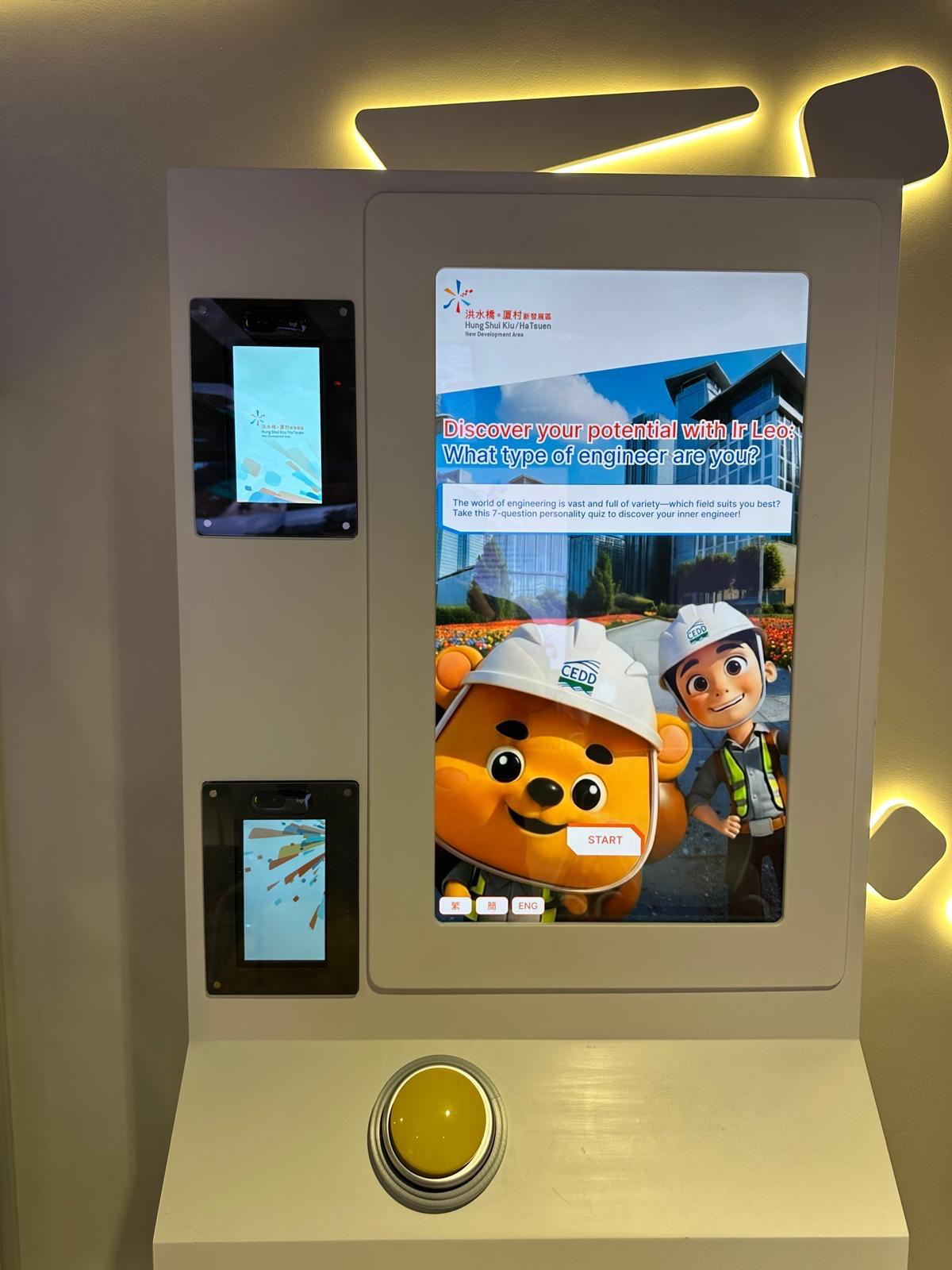 The Civil Engineering Development Department (CEDD) needed to engage visitors to their new multimedia space in Hung Sui Kiu to discover potential career paths within the department. As the UX/UI designer and creative, I designed a simple and self-explanatory interface with playful, approachable designs aligning with HSK visual identity. The kiosk needed to work seamlessly for diverse audiences across all ages and tech literacy levels, delivering quick and impactful engagement without staff supervision.