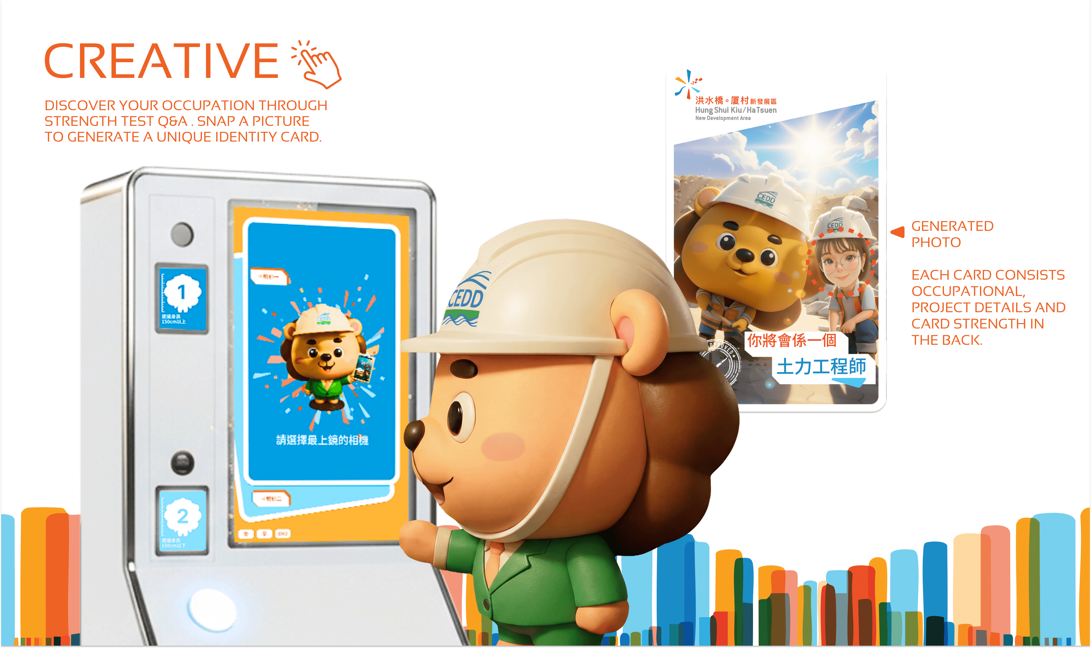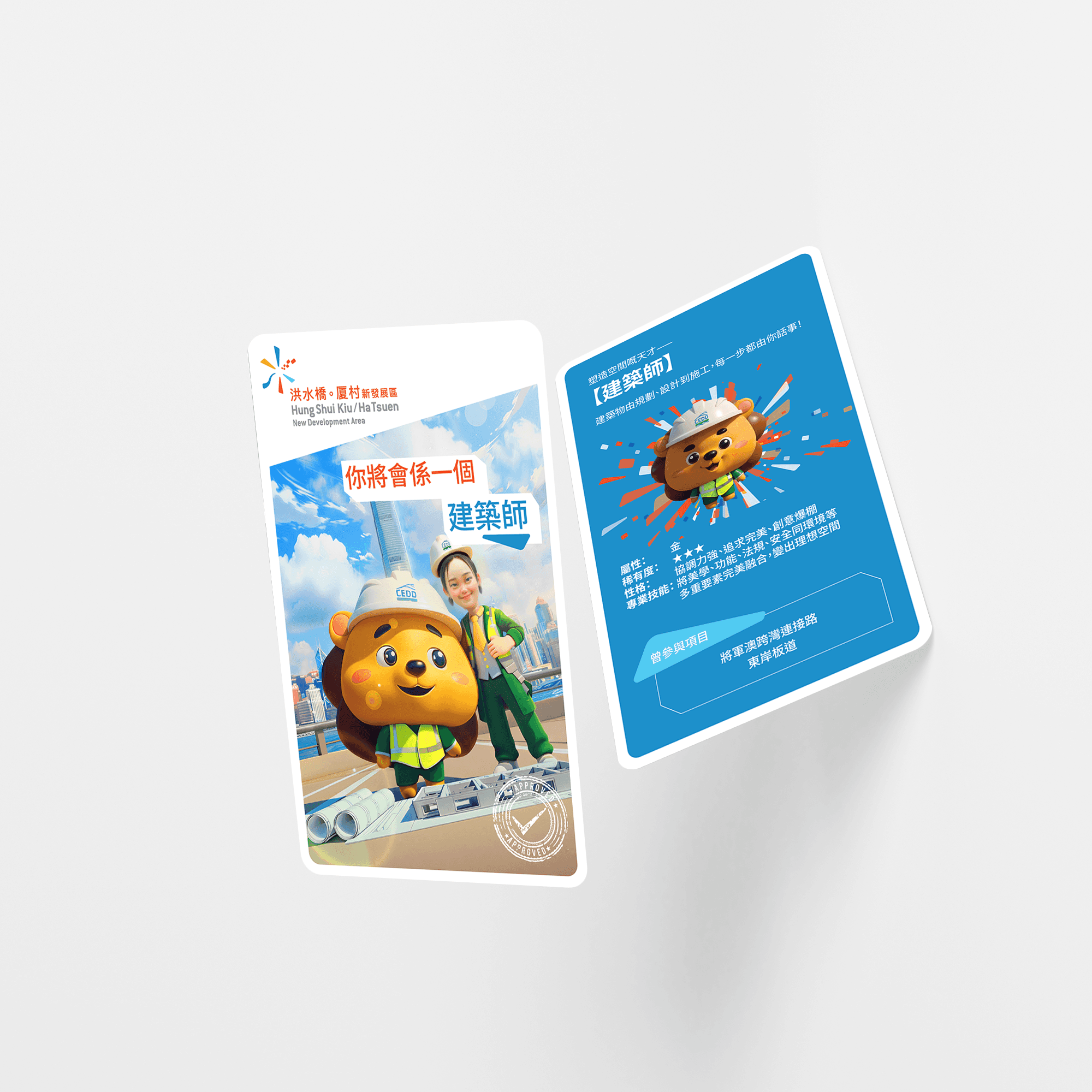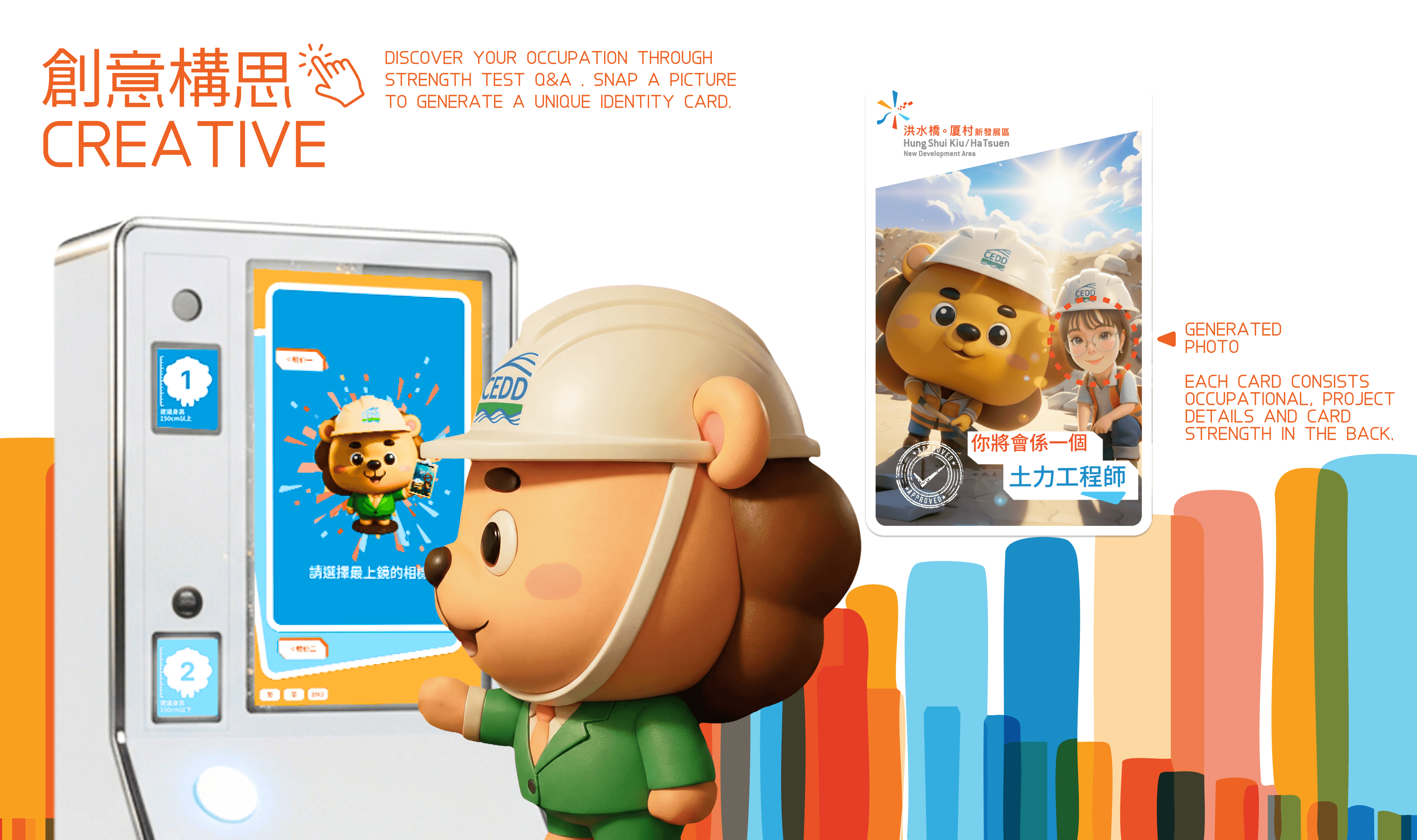 Traditional career information tends to be dry and text-heavy, failing to engage visitors meaningfully. The solution transformed a standard questionnaire result into a shareable experience centered around collectible cards. Visitors receive a personalized AI-generated photo featuring them in their potential CEDD role alongside the department’s lion mascot - printed as a collectible card they can take home.